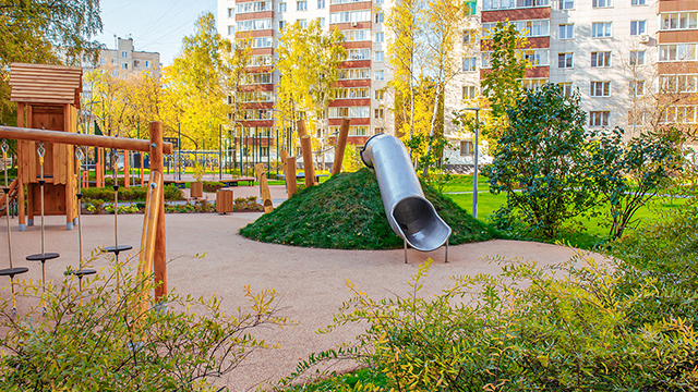 Особое внимание уделено и разнообразному озеленению: сотни кустов спиреи, десятки кленов и холмы, которые являются полноценными игровыми зонами.