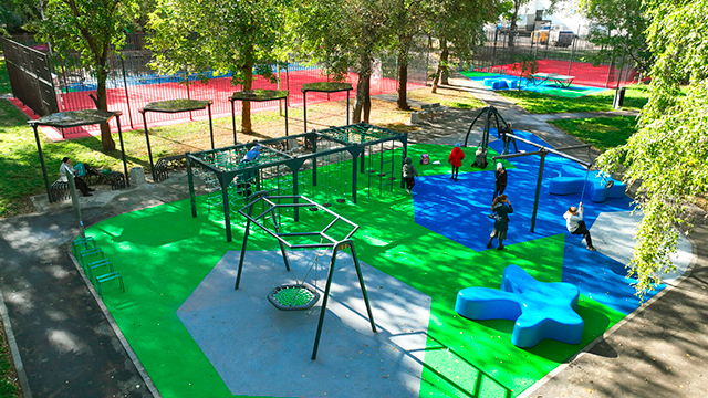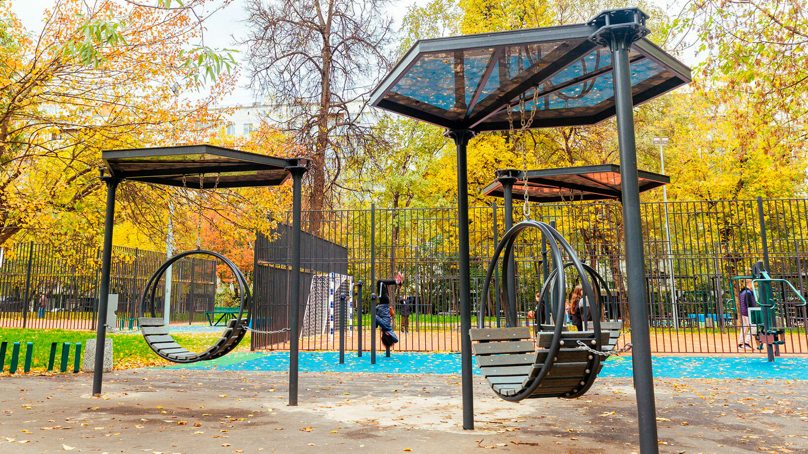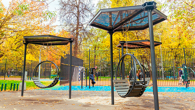 В общественном пространстве появилось несколько детских площадок. Школьников порадует игровой комплекс с горками, карусели, качели-гнезда и большой спортивный лазательный комплекс.