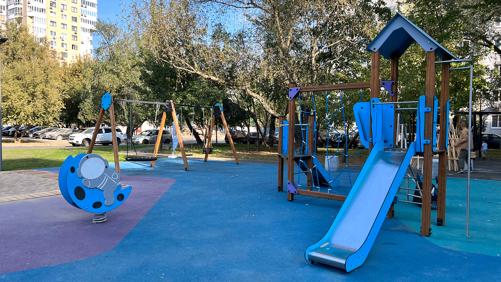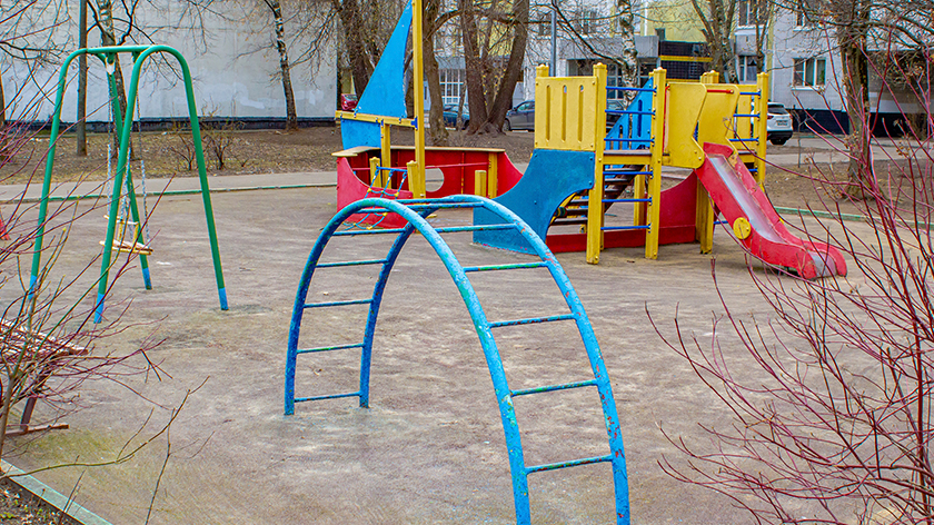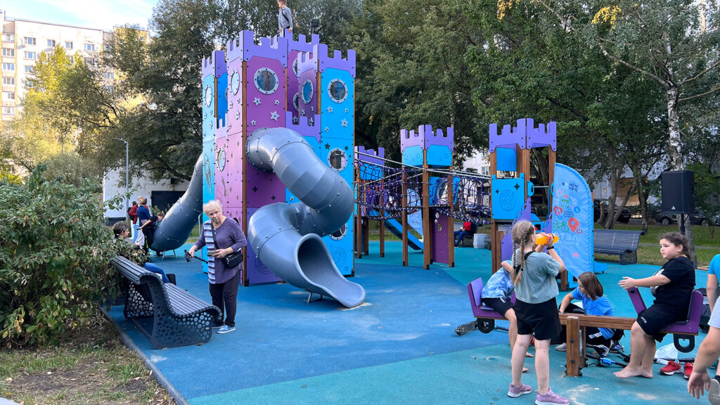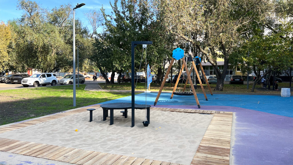 Игровая площадка для детей младшего возраста в южной части территории стала больше. Здесь установили большую песочницу, игровой комплекс и качели. Неподалеку разместились лавки для родителей.
