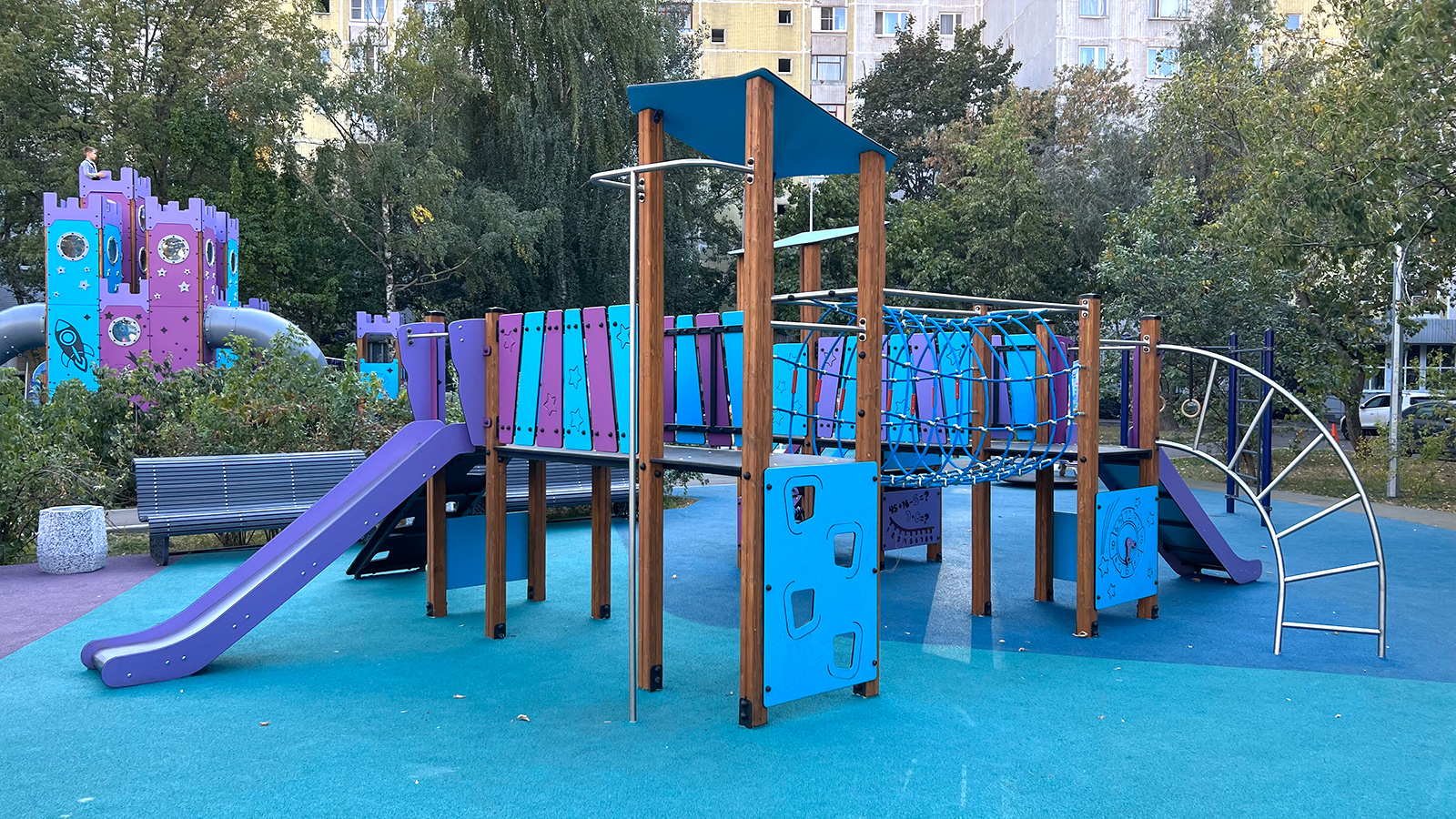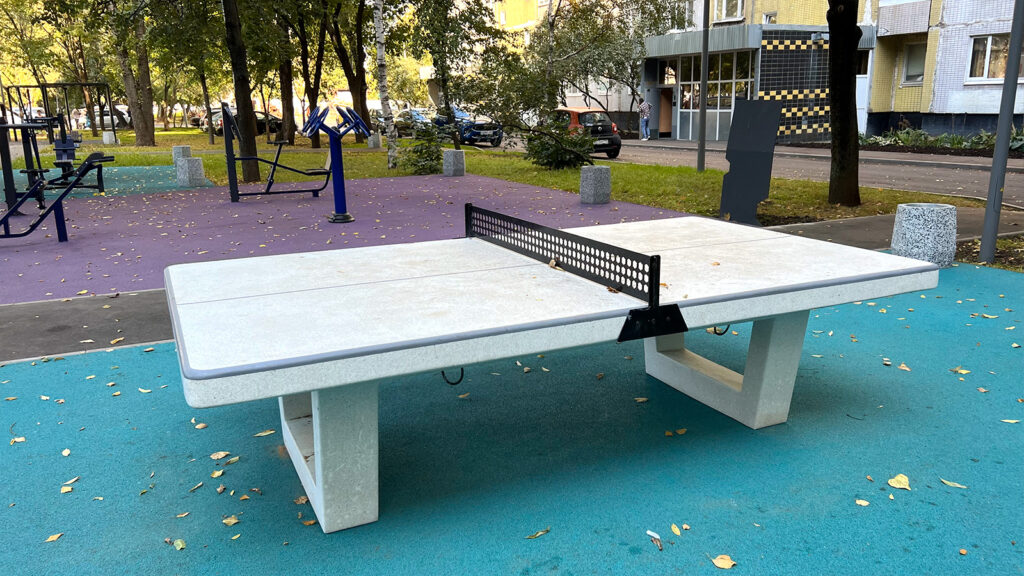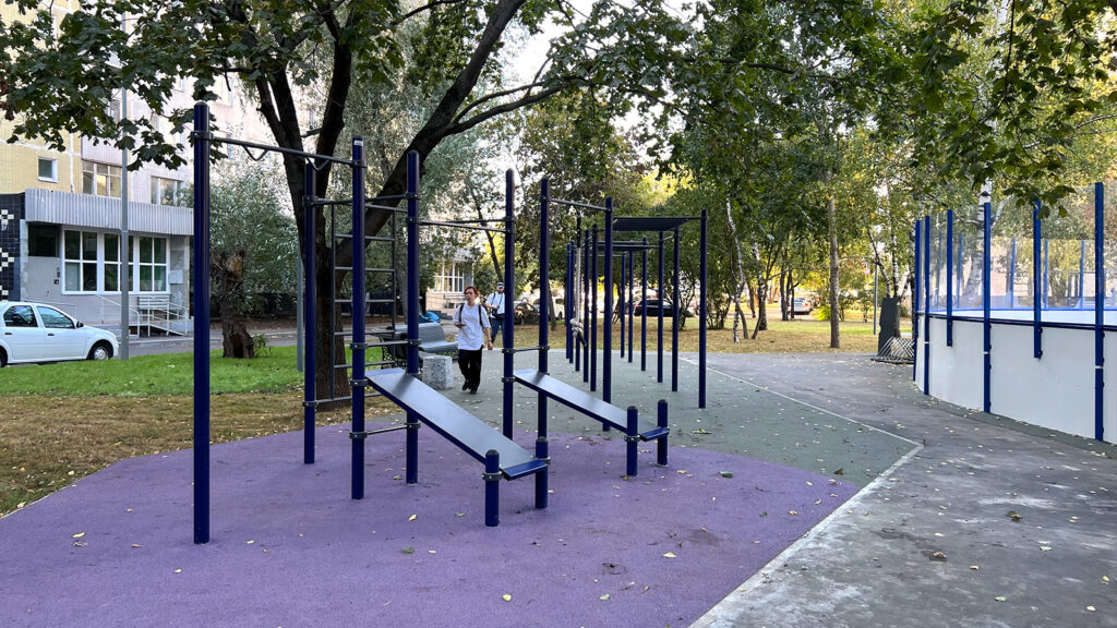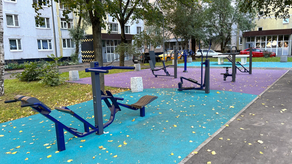 Изменены габариты и расположение спортивной коробки, и теперь это универсальная площадка для круглогодичного использования. Для любителей активного отдыха также установлены теннисные столы и тренажеры.
