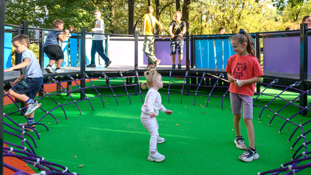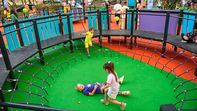 Для детей помладше установили канатный комплекс для лазания, качели, карусели. Предусмотрено специальное оборудование для маломобильных детей