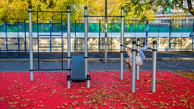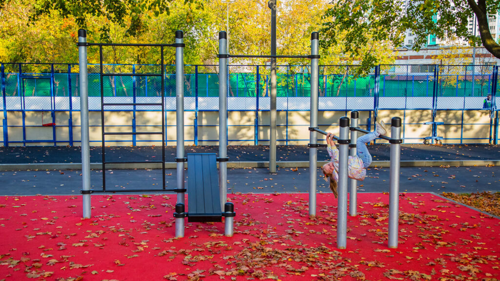Спортивная зона поделена на три участка: площадка для командных игр, теннисные столы и тренажеры с воркаутом