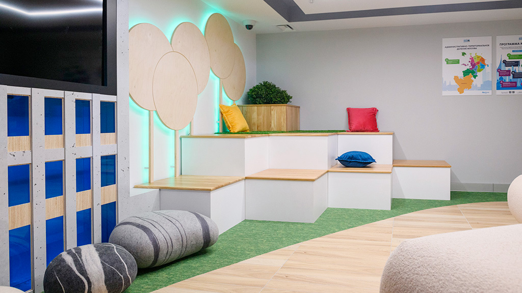 Вторая часть пространства «Мой район» – зона отдыха для гостей парка, где нашли отражение примеры наполнения современной городской среды (пуфы в виде гальки, «уличная» мебель абстрактных форм, многоярусный амфитеатр). Здесь любой желающий сможет отправиться в путешествие по столичным районам: проверить знания о Москве в интерактивной викторине, поиграть в тематические настольные игры, посмотреть ролики на большом экране.